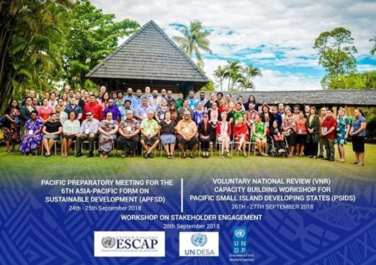 • L’échange de connaissances au niveau régional et le renforcement de la capacité de suivre et de rendre compte des progrès accomplis dans la réalisation des objectifs de développement durable ont culminé avec l’organisation aux Fidji, en septembre 2018, de l’atelier de renforcement des capacités en matière d’examen national volontaire des petits États insulaires en développement du Pacifique (photo du groupe de participants, en haut à droite) et, au Samoa, en novembre 2018, d’un atelier de développement des capacités dédié pour les cinq pays du Pacifique appelés à présenter leur examen national volontaire lors du forum politique de haut niveau pour le développement durable en 2019. Ces événements sous-régionaux ont permis aux pays d’apprendre les uns des autres et de s’appuyer sur l’expérience de Samoa et de Kiribati, les deux pays insulaires du Pacifique qui ont déjà préparé un examen national volontaire.